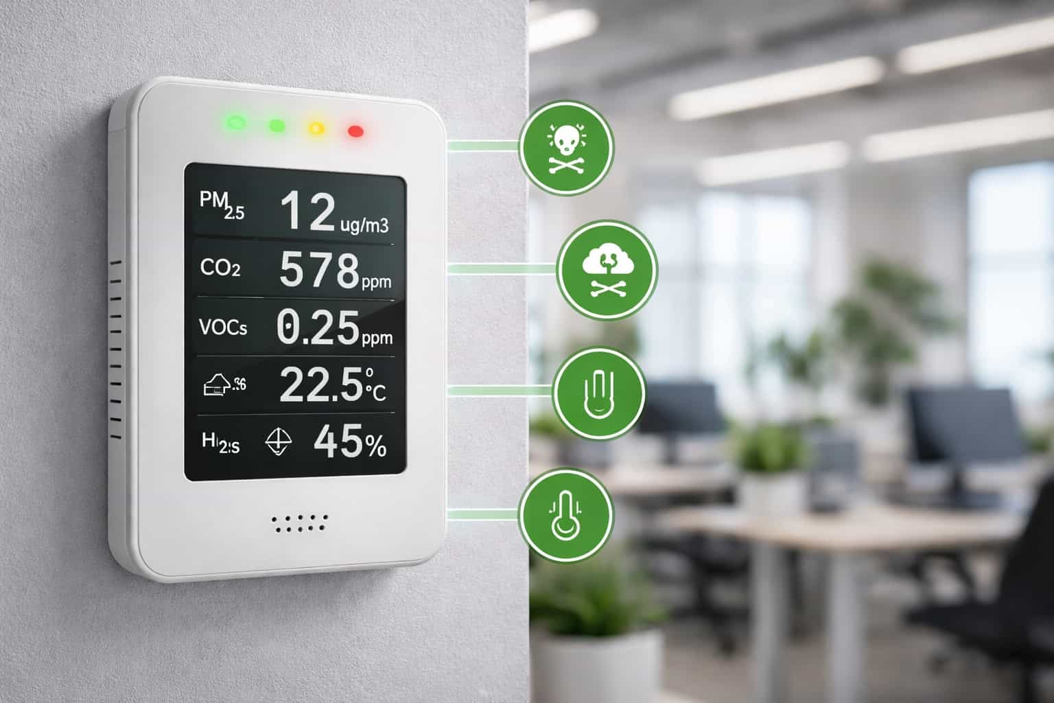 Air quality monitoring measures the levels of key airborne pollutants and environmental conditions inside a building. This includes gases and particulates that cannot be seen or smelled but can still impact health, comfort, and productivity. Continuous monitoring provides real time visibility, helping teams respond quickly when thresholds are exceeded.